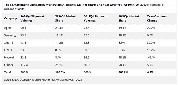 Huawei ranked fifth on the list with 32.3 million units sold and 8.4% global share due to sanctions. Huawei's cell phone shipments fell 42.4% year-on-year in the fourth quarter.