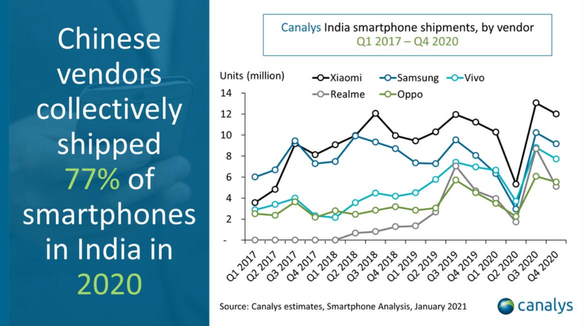 Chinese vendors account for about 77 percent of smartphone shipments in India in 2020, up 5 percentage points from 72% in 2019, according to a report from market research firm Canalys.