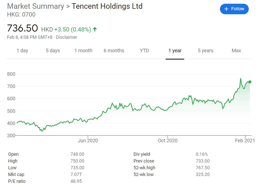 Tencent's share price was HK$739 per share. 2021 Tencent's share price hit a new high with a market value of over HK$700 million.