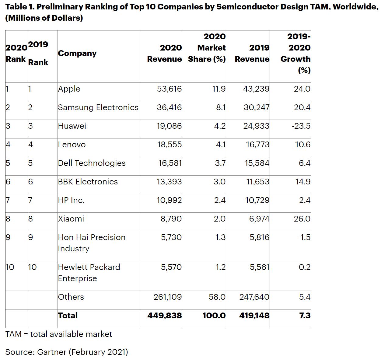 Chinese tech giant Huawei saw a 23.5 percent drop in semiconductor spending in 2020 compared to 2019, according to data released Tuesday by market research firm Gartner on the world's top 10 chip buyers.