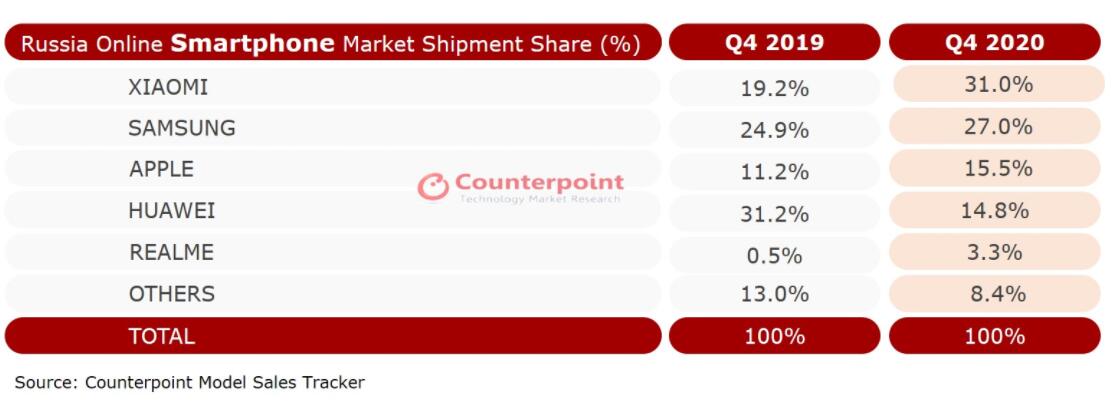 Xiaomi overtakes Samsung to rank first in the Russian online smartphone market in Q4 2020; Apple enters the top three for the first time and Huawei's share drops to 14.8% in fourth place, according to a new report from Counterpoint.