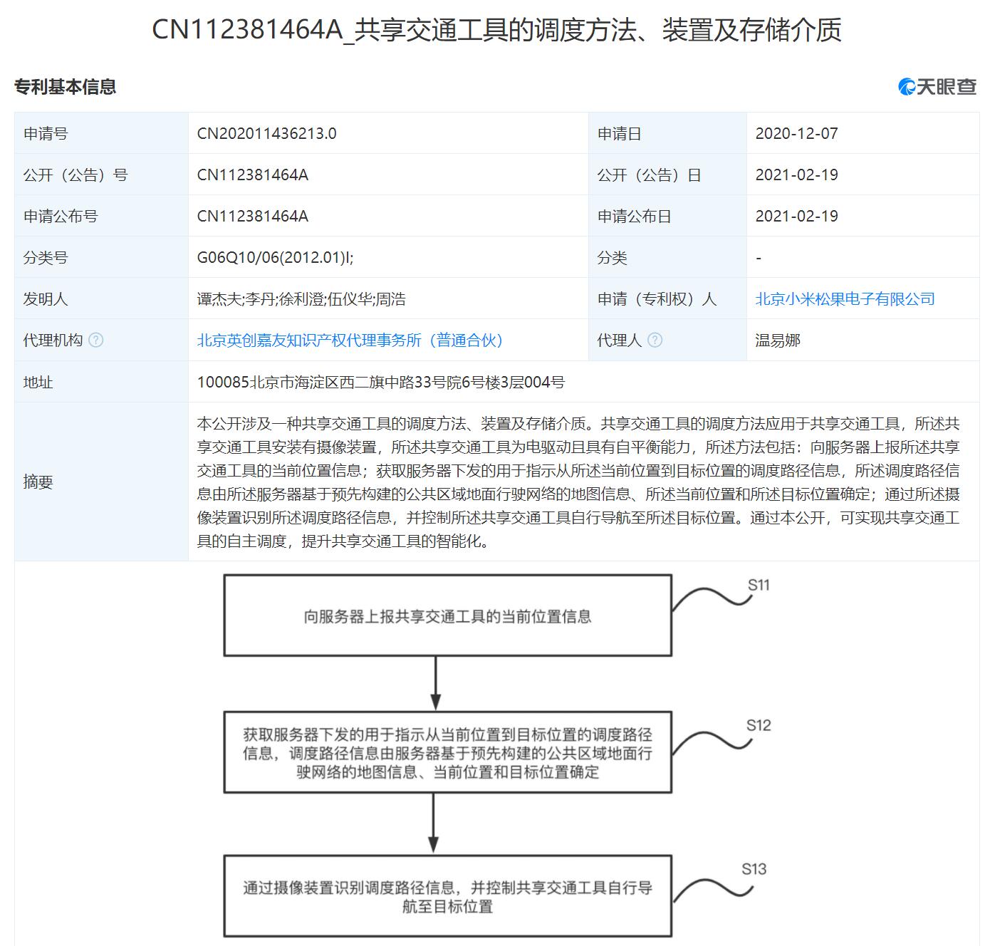 Beijing Pinecone Electronics, an affiliate of Chinese smartphone giant Xiaomi, on February 19 disclosed a patent for an invention titled "method, device and storage medium for scheduling shared vehicles," according to data provider Tianyancha.