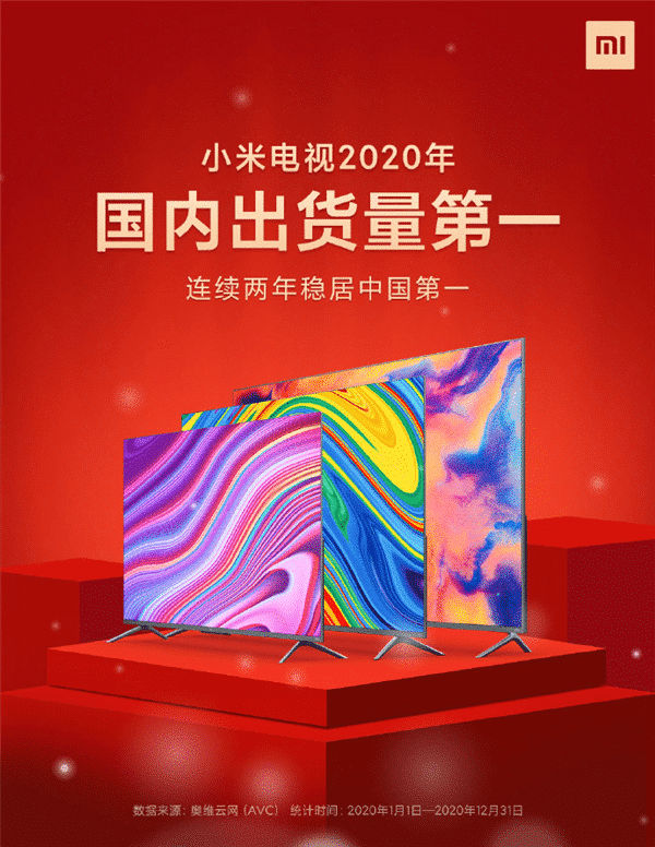 Xiaomi TV, Chinese smartphone maker Xiaomi's TV brand, announced on Weibo that it is No. 1 in terms of shipments in China in 2020, staying at the top spot for the second consecutive year.