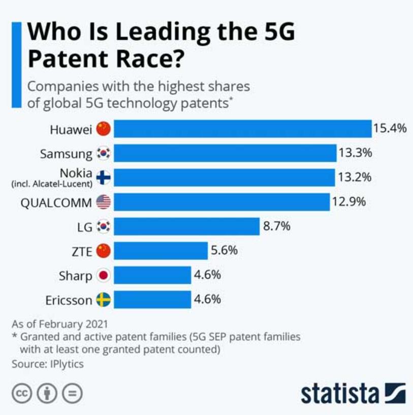 Huawei owns 15.4 percent of global 5G patents, the most in the world, according to IPLytics, a patent data provider.