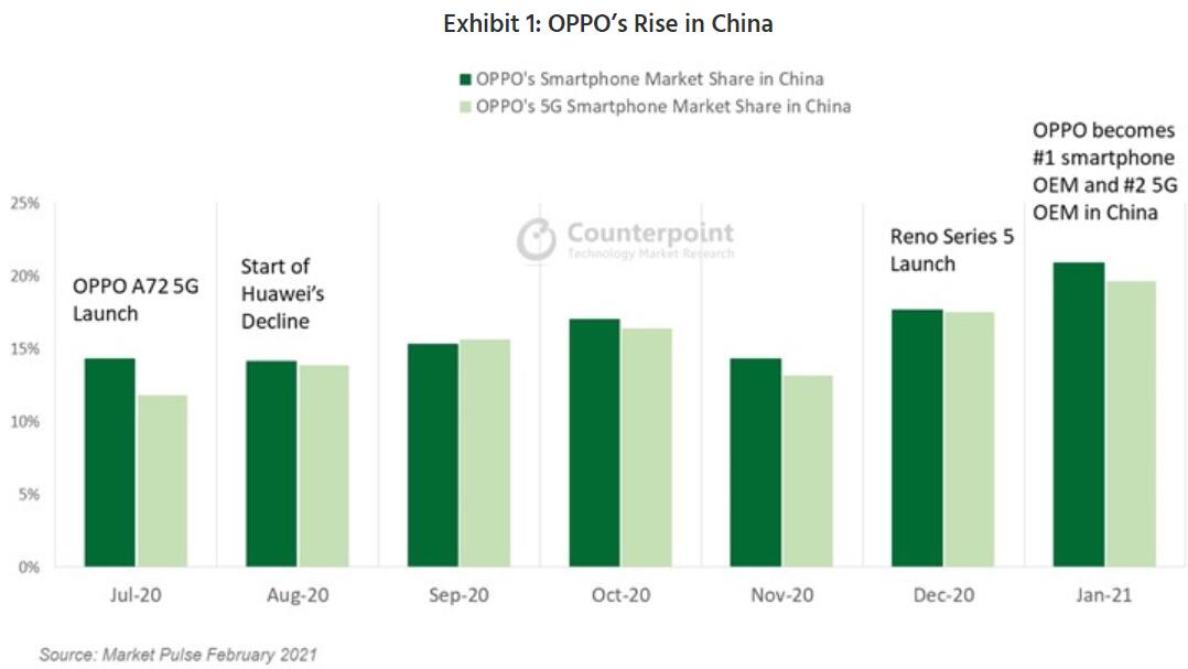 OPPO reached a 21 percent share of the Chinese smartphone market in January, surpassing Huawei to become the No. 1 smartphone brand in China for the first time, according to a report released Friday by market research firm Counterpoint Research.