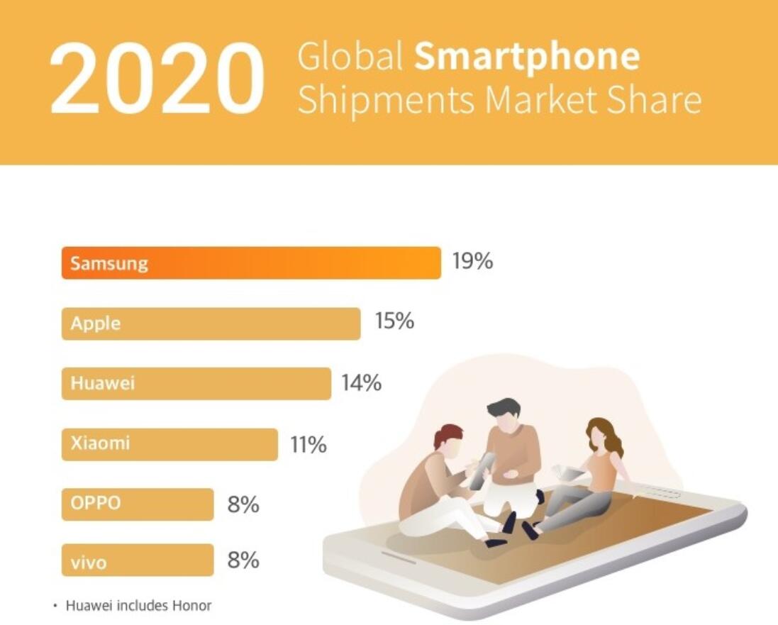 In 2020, Huawei (including Honor) and Xiaomi are in third and fourth place with 14% and 11%, respectively.