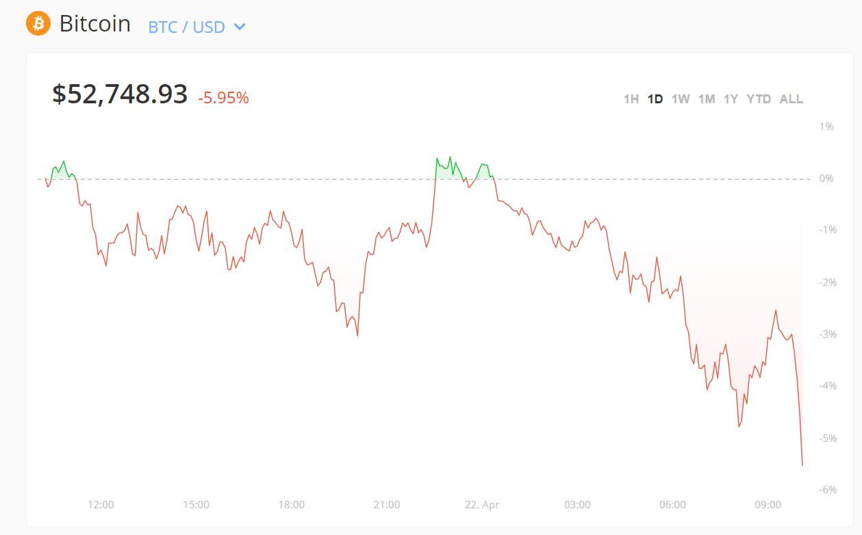 The price of the largest cryptocurrency by market capitalization is currently down below $53,000, down nearly 6% from 24 hours ago, according to quotes from Bitstamp.