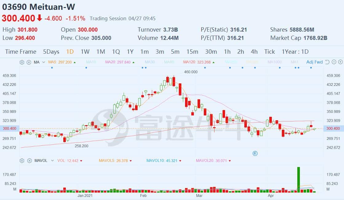 China's online-service super-app Meituan opened 1.64% lower to HK$300 on Tuesday after it was hit by an anti-monopoly investigation on Monday. By press time, its decline had narrowed to 1.5 percent.