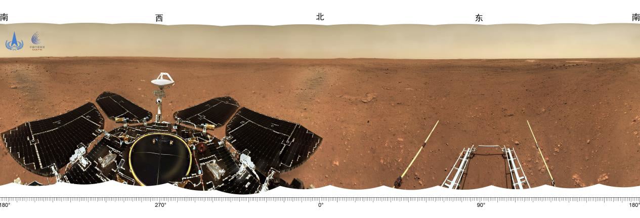 The China National Space Administration on Friday released images taken by the Zhurong Mars rover, including a panoramic view of the landing site and the terrain of Mars, according to CCTV.