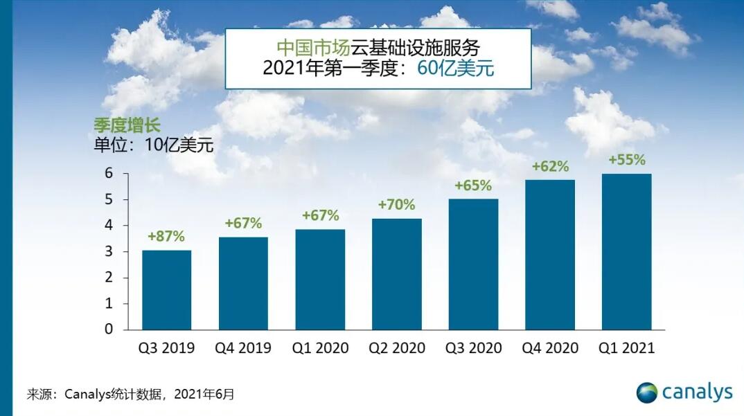 Spending on cloud infrastructure services in China increased by $2.1 billion, or 55 percent, to $6 billion in the first quarter of 2021 compared to the same period last year, according to market research firm Canalys.