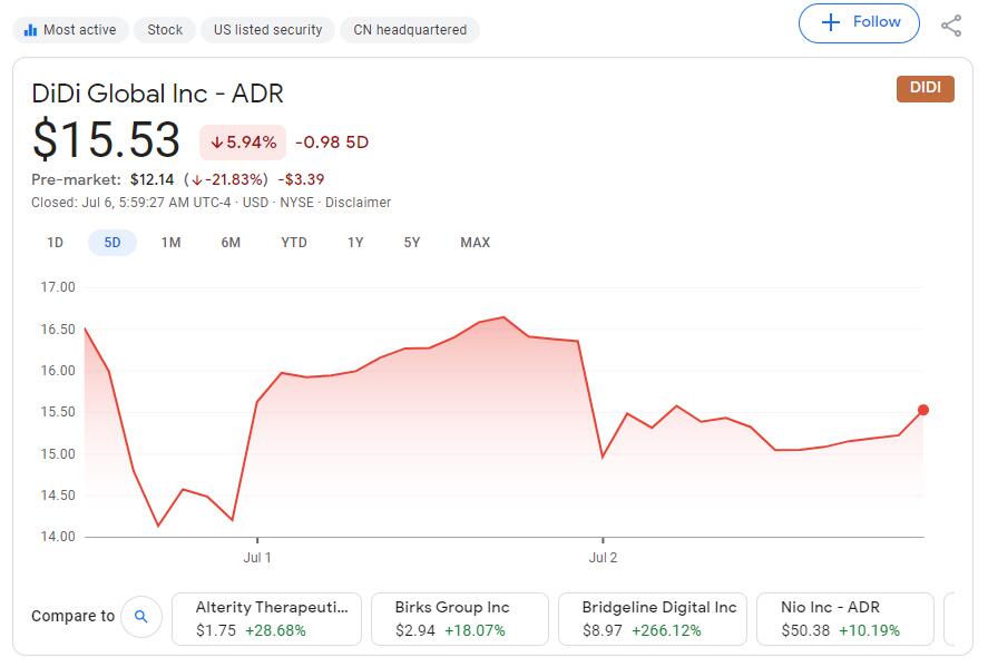 Didi, the Chinese ride-hailing giant listed on the New York Stock Exchange, was down about 30 percent at one point before its losses shrunk to about 22 percent. Didi only went public in the US last week, and Tuesday was its fourth day of trading.
