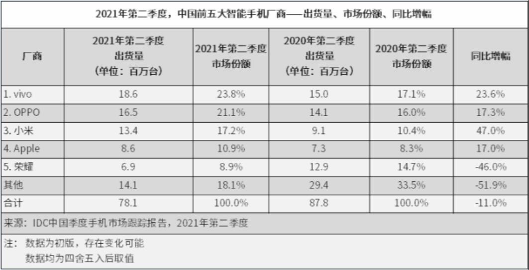 OPPO shipped 16.5 million units in the second quarter, with a market share of 21.1 percent, up 17.3 percent year-over-year, ranking second.