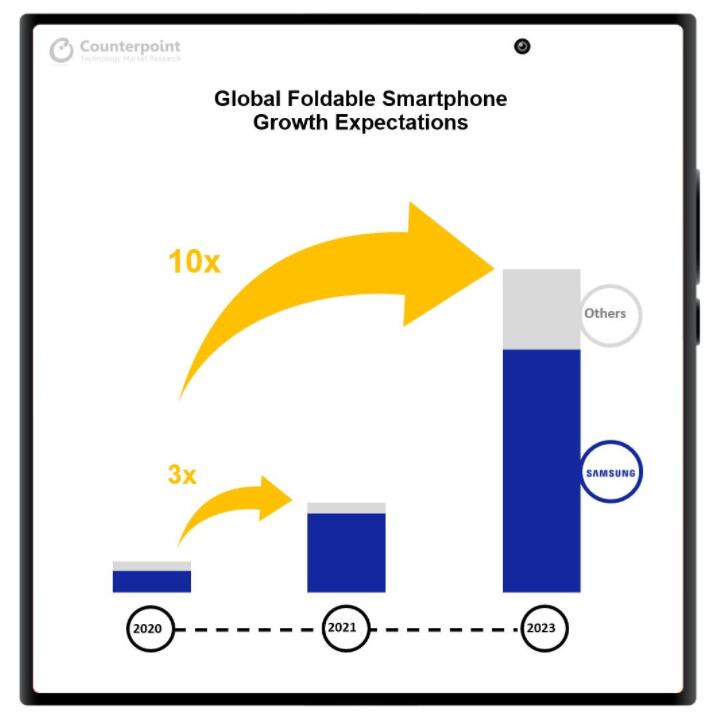 Counterpoint expects about 9 million foldable phones to be shipped in 2021, giving Samsung an 88 percent market share, and Samsung is expected to maintain a 75 percent market share by 2023.