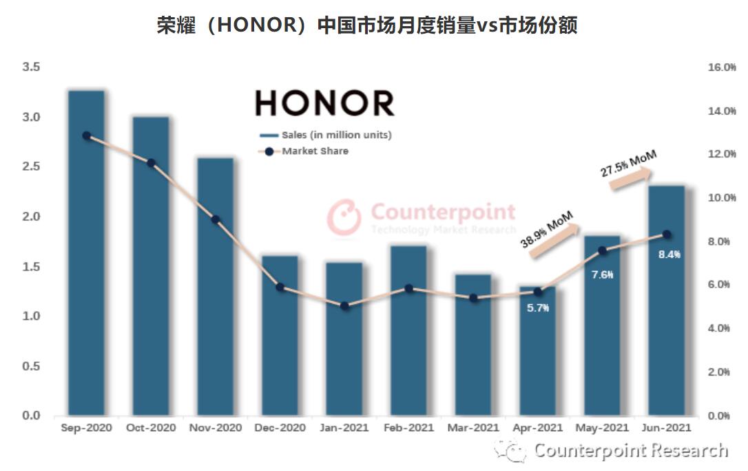 Honor's market share in China has rebounded from 5.1 percent in January to 8.4 percent in June, according to a report released Friday by market research firm Counterpoint Research.