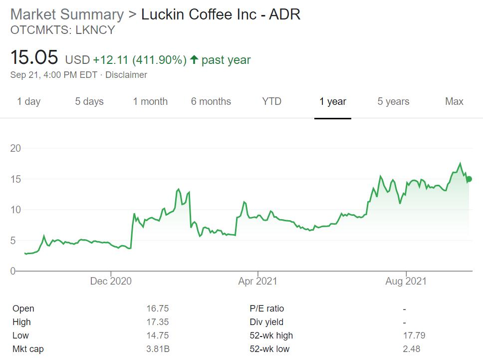 By the close of trading, Luckin Coffee's gains narrowed to 3.4 percent to $15.05. Since its delisting on June 29 last year, the company has accumulated a 990 percent gain in the Pink Sheets market. In the past year, it rose about 412 percent.