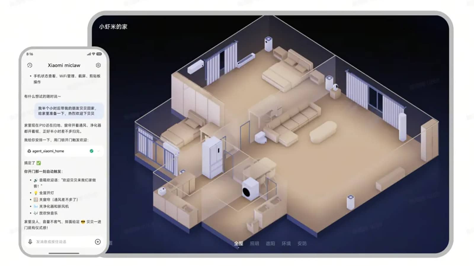 It can deeply invoke mobile applications and control over one billion IoT devices connected to the Mijia ecosystem through a complete Mijia protocol client.